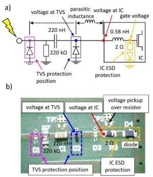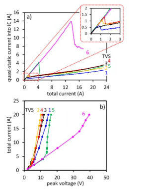 Figure 3 a) shows the residual current into the IC and b) the peak voltage at the IC. While TVS 5 can strongly reduce the IC current after turning on, TVS 6 manages to divert only about 50% away from the IC. This is a