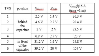 In this article the effect of the TVS placement and the device properties on the IC is investigated. Special PCBs have been produced; one is shown in Figure 1. The distance between TVS and an IC replacement consisting of a 2 Ohm resistor and a forward biased diode is varied. The voltage at the IC can be measured. The IC residual current is determined by measuring the voltage drop across the resistor. Six different TVS protection devices have been chosen. All of them have a capacitance of less than 0.2 pF which makes them suitable for the SuperSpeed application. Two of them are placed in front of the capacitor. However, to avoid turning on during a short to the power line these TVS device requires a breakdown voltage larger than 20V. For a placement behind the capacitor a high breakdown voltage is not needed. An overview of the TVS parameters is shown in Table 1.