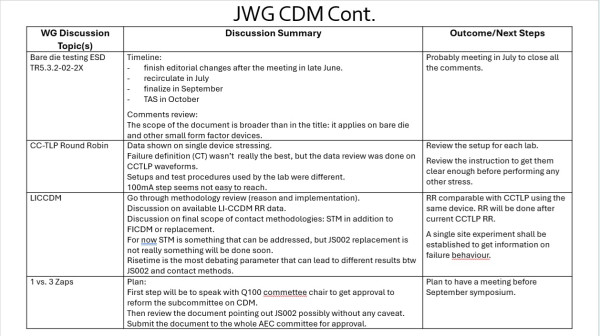 The JWG adjudicated the remaining TAS comments for JTR002 CDM User Guide Revision, reviewed the next steps for CC-TLP with a presentation and round robin data gathering discussion, and reviewed the bare die TR draft status.