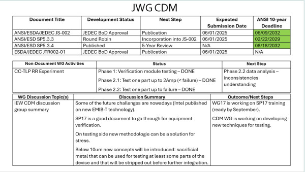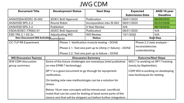 The joint working group adjudicated industry review comments on the five year review revisions of ANSI/ESDA/JEDEC JS-002. The joint working group also adjudicated TAS comments on the new user guide technical report – ESD JTR002-01. A data update on the LICCDM round robin was given and methods for improving current measurement were discussed. STDCOM VBM comments for a new standard practice on CC-TLP (ESD WIP5.3.4) were adjudicated.