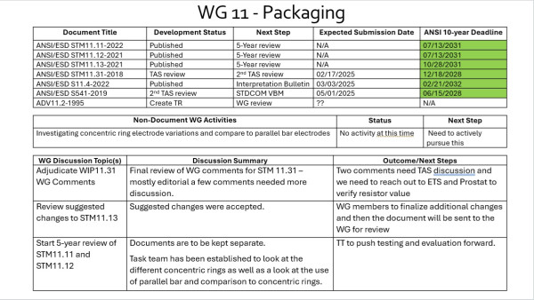 WG discussed whether to reaffirm ANSI/ESD S11.4 as is, and a decision was made to reaffirm the document. WG discussed whether to add an informative Annex to the documents ANSI/ESD S541 and ANSI/ESD S11.31 regarding the interpretation of the energy waveform. The WG also discussed the status of inclined plane round-robin and box shielding task teams for revisions to ANSI/ESD S541. There was some discussion on forming a task team to put together the comparison of the concentric ring and parallel bar electrodes for surface resistance. It was also mentioned that the WG needs to start /continue reviewing the packaging section of ESD TR20.20.