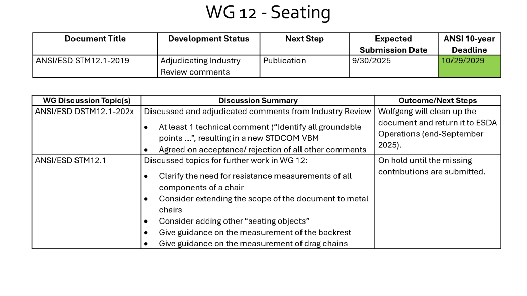 As a reminder of our current activities in WG 12, I have attached the slide set and the minutes of the 2025 September meeting series. In March, we will hold a 1.5-hour meeting to address adjudication of the STDCOM re-vote comments on the revised version of ANSI/ESD STM12.1 and the next tasks for WG 12.
