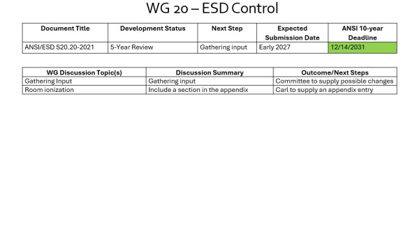 The WG discussed the revisions needed for TR20.20 “Handbook for the Development of an Electrostatic Discharge Control Program for the Protection of Electronic Parts, Assemblies and Equipment”