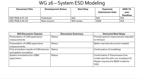 A presentation was given on a quasi-static model to evaluate if the exchange format works. An update was given on a modular PCB approach for validation. The status of ESD TR26.0-01 and ESD TR26.0-02 was also reviewed.