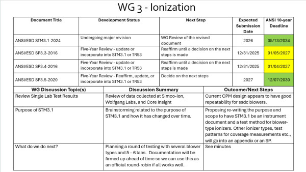 WG focused on the review of STDCOM comments on ANSI/ESD SP3.4 “Periodic Verification of Air Ionizer Performance Using a Small Test Fixture” and made any necessary changes. ANSI/ESD STM 3.1, “Ionization”, is also going through an update process, with initial STDCOMV VBM comments being reviewed and changes being made.
