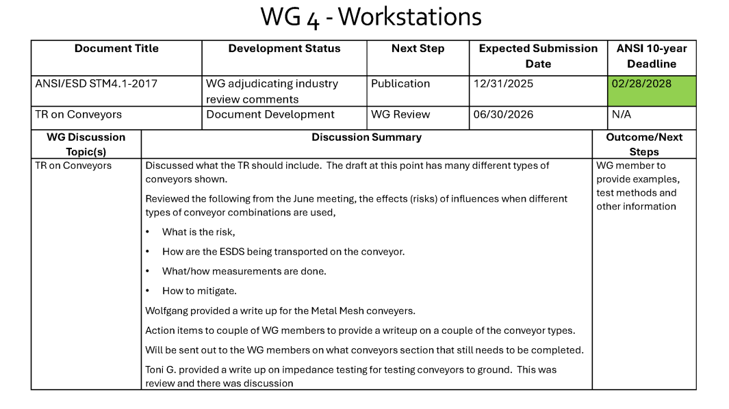 The committee worked on the five-year review of ANSI/ESD STM4.1. The WG also reviewed a conveyor presentation that represented a snapshot of methods to measure resistance by various methods.