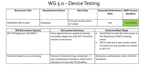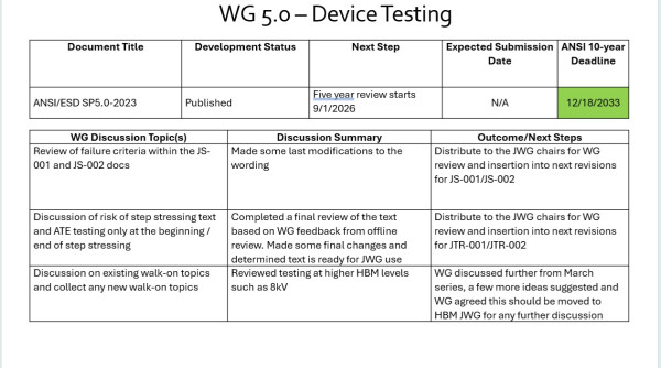 The group completed the five-year review of ANSI/ESD SP5.0. There was also a discussion on how die-to-die interfaces are handled regarding ESD targets and testing.