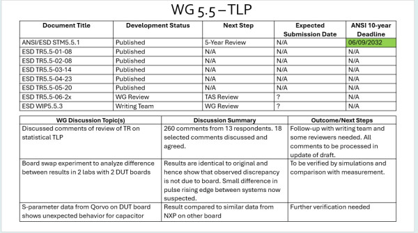 The WG adjudicated the Industry Review comments on STM5.5.1 “Transmission Line Pulse (TLP) – Component Level” and determined that 2 minor technical changes need to be made before moving the document forward.