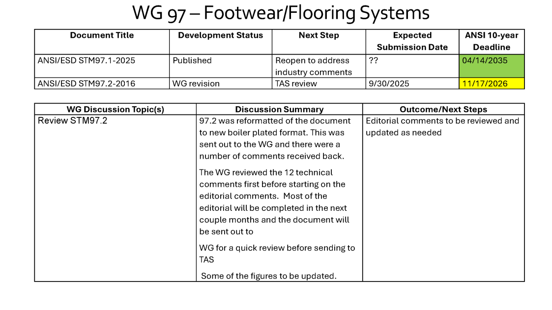 During this virtual meeting, the WG working reviewed WG member comments on ESD WIP97.1 - Footwear / Flooring System – Resistance Measurement in Combination with a Person.