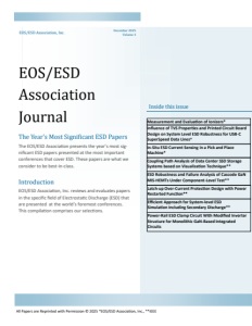 EOS/ESD Association Journal EOS/ESD Association, Inc. Inside this issue The Year’s Most Significant ESD Papers The EOS/ESD Association presents the year’s most significant ESD papers presented at the most important conferences that cover ESD. These papers are what we consider to be best-in-class. Introduction EOS/ESD Association, Inc. reviews and evaluates papers in the specific field of Electrostatic Discharge (ESD) that are presented at the world’s foremost conferences. This compilation comprises our selections. December 2025 Volume 4 All Papers are Reprinted with Permission © 2025 *EOS/ESD Association, Inc., **IEEE Influence of TVS Properties and Printed Circuit Board Design on System Level ESD Robustness for USB-C SuperSpeed Data Lines* In-Situ ESD Current Sensing in a Pick and Place Machine* Measurement and Evaluation of Ionizers* Latch-up Over-Current Protection Design with Power Restarted Function** ESD Robustness and Failure Analysis of Cascode GaN MIS-HEMTs Under Component-Level Test** Coupling Path Analysis of Data Center SSD Storage Systems based on Visualization Technique** Efficient Approach for System-level ESD Simulation Including Secondary Discharge** Power-Rail ESD Clamp Circuit With Modified Inverter Structure for Monolithic GaN-Based Integrated Circuits