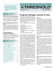 THRESHOLD News bits The ESD Association newslet- ter, for everyone with an interest in the understanding and control of electrostatic discharge. ™ Volume 21, No. 2 March/April 2005 Program Manager in Asia ......... 1 Standards activity update ......... 2 From the President .................. 3 Website updates ...................... 3 2005 symposium program ....... 4 Education schedule for 2005 .... 5 Professional certification .......... 6 BoD nominations ...................... 6 Corporate membership ............ 7 Device/Design Seminar ........... 7 Online tutorial: grounding .......... 8 Symposium schedule .............. 8 Forum in the Philippines ........... 9 June meeting schedule .......... 10 Exhibit at symposium ............. 10 And the survey says ................ 11 Calendar ................................. 12 In this issue In Program manager courses in Asia Continued on page 2 This March the ESD Association again of- fers education opportunities in Asia. Four cities in Asia will host program manager certification related courses: Manila, Phil- ippines; Bangkok, Thailand; Penang, Ma- laysia; and Singapore. Course offerings include the following: • ESD Basics • ESD Auditing and Evaluation Measurements • ESD Program Development and Assessment • Packaging Principles for the Program Manager • ESD Standards Basics for EPA The demand for knowledgeable ESD program managers is growing. Qualified ESD personnel are needed to design, implement, and manage today’s ANSI/ESD S20.20 control programs to protect sensi- tive devices and assemblies. Organiza- tions and facilities with qualified ESD per- sonnel on staff are better prepared for S20.20 facility certification. These courses are designed to educate and train professional ESD program man- agers. The courses offered during this seminar series are required courses to obtain the ESD Association’s ESD Certi- fied Professional-Program Manager certi- fication. Although other tutorials and semi- nars are also necessary to fulfill the certifi- cation requirements, these programs are critical to understanding ESD fundamen- tals, program development and certifica- tion, and the ongoing process of verifying performance of a program’s technical ESD controls. Courses will be taught by Ron Gibson, Celestica International, Inc.; Stephen A. Halperin, Stephen Halperin & Associates, Ltd.; and John Kinnear, IBM. The following are brief descriptions of course content. Next online course: grounding The date is set: March 30. Instructor Dave Swenson prepares an hour of instruction that can be gained from the convenience of your desk. See page 8 for details. ESD Basics This tutorial consists of three sections. Section A defines the causes of ESD and critical elements related to charge genera- tion, material characteristics, and electro- static phenomenon. Section B explains and demonstrates the four critical device failure models. Section C provides an over- view of device protection during handling and product assembly, a summary of ESD control elements, and a fundamental over- view of S20.20 program requirements. This full day course is required for those in-plant auditors and program managers who are working toward professional ESD certification. ESD Auditing & Evaluation Measure- ments This program was designed to support S20.20 in-plant verification requirements. It reviews the evaluation and audit mea- surement procedures for S20.20 ESD Controls listed in the S20.20 document, Table 1-ESD Control Program Technical Requirements Summary. These recommended measurement procedures confirm the proper operation and use of ESD control products and ma- terials selected as part of a facility's S20.20 ESD control program. This course is an ESDA certification requirement for in-plant auditors and program managers who are working toward professional ESD certifi- cation. ESD ProgramDevelopment and Assess- ment This seminar provides instruction on de- signing and implementing an ESD control program based on ANSI/ESD S20.20. The course provides participants with the tools and techniques to prepare for an ESD fa- cility audit. Device/Design Seminar set for May The Device/Design Seminar, which counts toward four classes required for ESD Cer- tified Professional-Device/Design certifi- cation is set for May 23-24 at ESDA Head- quarters. See page 7 for more informa- tion. Board of Directors nominations underway Candidates for the 2006 ESDA Board of Directors have been nominated and bal- lots will soon be sent to the general mem- bership. See page 6 for details.
