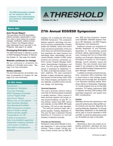 THRESHOLD The ESD Association newslet- ter, for everyone with an interest in the understanding and control of electrostatic discharge. ™ News bits Volume 21, No. 4 September/October 2005 27th Annual EOS/ESD Symposium Continued on page 2 Anaheim, CA, is hosting the 27th annual EOS/ESD Symposium. This symposium features research, technology, and solu- tions to enhance understanding, increase quality and reliability, reduce and control costs, and improve productivity. It's the one event where you will find technical papers that emphasize the latest research and technology; basic, intermediate, and ad- vanced tutorials; exhibits of ESD control products and services; workshops; au- thors' corners; Program Manager Certifi- cation; Device/Design Certification; and more. The 27th annual EOS/ESD Sym- posium is scheduled for September 11- 16, 2005, at the Marriott Anaheim in Ana- heim, California. This year's symposium features in-depth educational opportuni- ties focused on three primary tracks: ESD Test, Failure Analysis, and Systems; Fac- tory, Materials, and ESD Control; and De- vice, Design, and Technology. Technical Sessions This year's technical sessions feature more than 50 technical papers presented in parallel sessions. Topics covered in these technical sessions will include on- chip physics/modeling; on-chip RF; on- chip latchup; system level ESD, factory and materials; on-chip CMOS; MR heads and testing, TLP and on-chip standards. The technical sessions begin with a plenary speaker, Tuesday, September 13. This year the topic is Advanced Thermal Modeling of Transistors by Kenneth Goodson of Stanford University. Tutorials and Workshops Symposium week opens officially on Sun- day, September 11, with a full day of ESD tutorials. These in-depth, full-day ses- sions include courses such as ESD Ba- Asia Forum Report This past March the ESD Association offered education opportunities in Asia. Four cities in Asia hosted the program manager certification related courses. Also in March, the Philippine Electro- static Discharge Forum was held in the Phillipines. See page 5 for details. Packaging Principles course The ESD Association is offering a course on ESD Packaging Principles on Wednes- day October 12. Se e page 3 f or details. Website continues to change We are continuing to streamline the website so it will better serve users. See page 5 f or more information. Online seminar The next online seminar, Air Ionization, has been re-scheduled for October 25. See page 8 for more information. sics, ESD On-Chip Protection, System Level ESD/EMI, ESD/EMI Systems Test- ing to IEC Standards, and ESD Program Development and Assessment. Additional tutorials are scheduled for Monday, September 12, and Thursday, September 15. The preliminary tutorial schedule reflects approximately 23 ses- sions, including How To's of In-Plant ESD Auditing and Evaluation Measurements, Packaging Principles for the Program Manager, and Air Ionization: Issues and Answers. Two new tutorials have been added to the schedule to help attendees obtain the ESD Certified Professional-Pro- gram Manager certification. In addition to tutorials and technical ses- sions, symposium offers workshops held in panel format to help facilitate greater learning and encourage peer discussions in an interactive workshop setting. Work- shops offered on Wednesday, September 14, include subjects such as on-chip ESD protection, TLP testing, cleanrooms, ESD in magnetic recording, ESD auditing, ESD automated equipment, and system level ESD considerations. Exhibits Attendees will have the opportunity to visit nearly 80 exhibit booths offering ESD con- trol products and services. Beginning the evening of Monday, September 12, through Wednesday, September 14, the exhibit hall will be open to anyone interested in EOS and ESD. Currently all exhibit space is sold out. All exhibits are open to the public. Networking Networking is also a key reason for at- tending symposium. Attendees will have the opportunity to discuss the technical In this issue Symposium ........................... 1-2 Symposium Schedule .............. 2 From the President .................. 3 ESD Packaging Principles ....... 3 Call for Papers 2006 ................ 4 Asia Forum Report ................... 5 What’s new on the website ... 5-6 New Volunteer Spotlight ............ 6 New StandardsAvailable .......... 7 2006 Symposium program....... 7 Buyer’s Guide Listings ............. 7 Online tutorials update .............. 8 Presentations on CD ................ 8 Exhibit at symposium ............... 9 New vice president appointed .. 9 September meeting schedule 10 Local scene in Anaheim ......... 10 New Staff at Headquarters ...... 11 Calendar ................................. 12