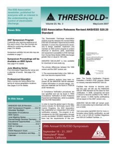 The ESD Association newsletter, published for everyone with an interest in the understanding and control of electrostatic discharge. News Bits In this issue Volume 23, No. 3 May/June 2007 The Electrostatic Discharge Association (ESDA) recently released the revised ANSI/ ESD S20.20 standard. Approved as anANSI standard, it covers the requirements neces- sary to design, establish, implement, and maintain an ESD control program to protect electrical or electronic parts, assemblies and equipment susceptible to ESD damage from Human Body Model (HBM) discharges greater than or equal to 100 volts. ANSI/ESD S20.20-2007 is now available for download at www.esda.org. The primary differences between the 1999 version and the 2007 revision are: 1) The recommended limits in the 1999 ver- sion now become required limits. 2) The guidance sections have been re- moved for the ANSI/ESD S20.20 standard. Further information on process design, con- trols and materials can be found in TR20.20 (ESD Handbook). 3) Compliance Verification procedures are now specified and can be found in TR53 (Compliance Verification of ESD Protective Equipment and Materials), which is available from the ESD Association. In order to meet the global need in the elec- tronics industry for technically sound ESD Control Programs, the ESD Association has established an independent third party certification program. The program is ad- ministered by the ESD Association through country-accredited ISO9000 registrars that have met the requirements of this pro- gram. The Facility Certification Program evaluates a facility’s ESD program based on industry standard ANSI/ESD S20.20. Facilities that choose to become certi- fied this year will still use the ANSI/ESD S20.20-1999 standard as the basis for their certification. In 2008, companies will have a choice to become certified to the 1999 or 2007 version. In 2009, facility certifications will be based on the 2007 version only. ANSI/ESD S20.20-1999 will remain avail- able at www.esda.org to download until the end of 2008. Visit www.esda.org/s2020.html for more in- formation about facility certification, as well as for a list of S20.20 Certified Registrars and S20.20 Certified Facilities. p ESD Association Releases Revised ANSI/ESD S20.20 Standard 2007 Symposium Program Customize your learning experience at this year’s event. Plus new tutorials are offered for continuing education. See page 2 for details. Symposium exhibitor list and site map are available on page 7. Symposium Proceedings will be Available on IEEE Xplore See page 4 for details. June Meeting Series Find information regarding the venue and a calendar of events. See page 4 for details. Professional Education Many courses are being offered this spring at various geographic locations. See pages 5 & 9 for details. ANSI/ESD S20.20 Revision.............. 1 2007 Symposium Program. ...... 2 & 10 Volunteer Spotlight............................ 3 Standards of Excellence................... 3 IEEE Xplore. ..................................... 4 June Meeting Series......................... 4 Device/Design Seminar Germany..... 5 Educational Opportunities...........5 & 9 BoD Ballots................................. 6 & 7 ESD on Campus............................... 8 IEW................................................... 9 ESDA Research Grant.................... 11 Symposium Exhibitors and Map. .... 11 Calendar. ........................................ 12 ANSI/ESDS20.20-2007 Revision ofANSI/ESD S20.20-1999 For the Development of an Electrostatic Discharge Control Program for – Protection of Electrical and Electronic Parts, Assemblies and Equipment (Excluding Electrically Initiated Explosive Devices ) ElectrostaticDischargeAssociation 7900TurinRoad,Bldg. 3 Rome,NY 13440 AnAmericanNationalStandard ApprovedMarch 1, 2007