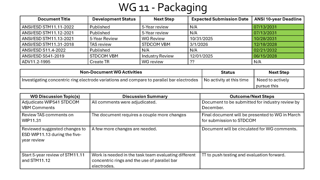 The committee worked on the five-year review of ANSI/ESD STM11.31 and ANSI/ESD S541. ADV11.2 was opened for discussion and review; may convert to an SP. The group terminated task teams for inclined plane and box shielding tests.