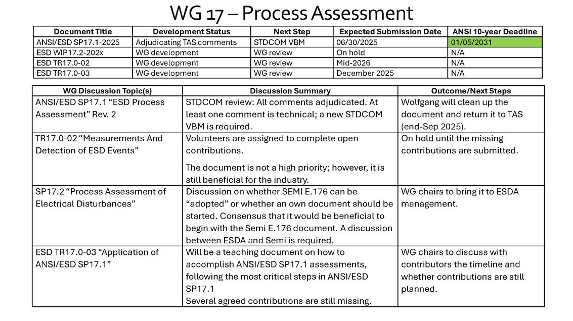 To remind you of our current activities in WG 17, we have attached the slide set from the September 2026 meeting series and the minutes. At the March meeting, we will focus on adjudicating Industry Review comments on ANSI/ESD SP17.1 and discuss necessary changes to the document and parking-lot items. Additionally, we plan to outline the next steps for our new documents, especially the new Technical Report (TR) on the Application of ANSI/ESD SP17.1 to process steps (“SP17.1 Handbook”), including die-to-die interfaces with very low ESD sensitivity.