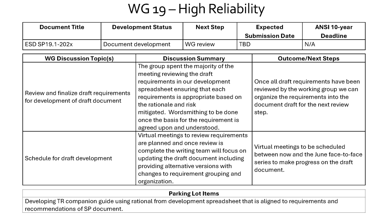 • Synopsis: The working group meeting was spent going through ANSI/ESD S20.20 and noting what might be added in SP19 as guidance for high-reliability control programs. This discussion will be distilled into an initial draft document.