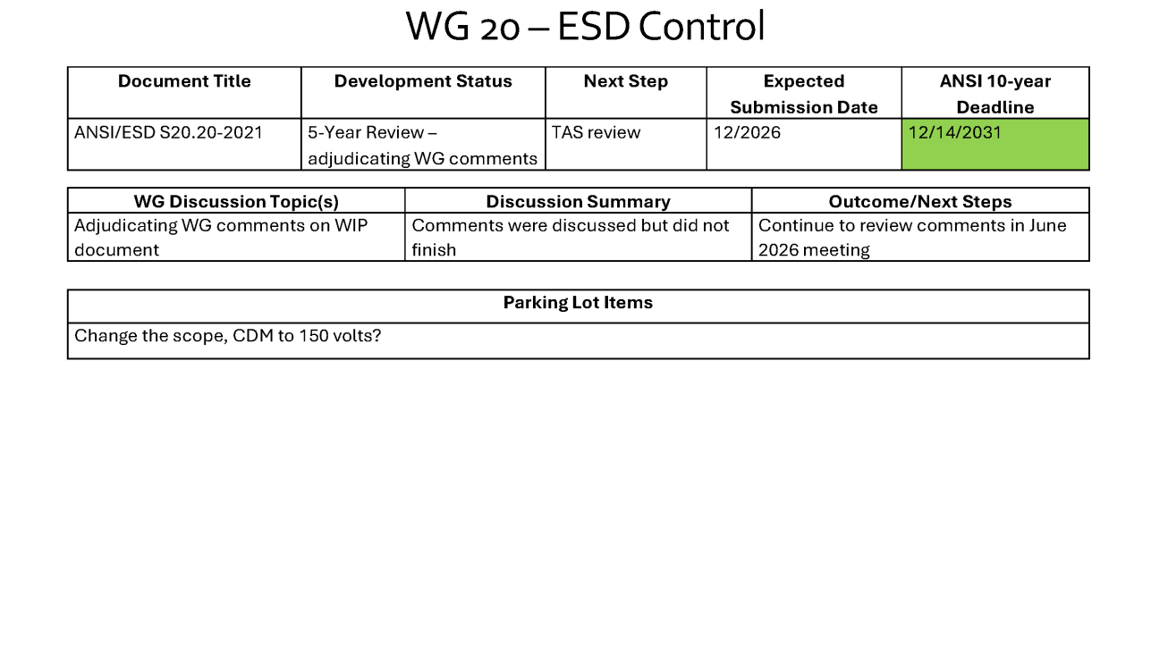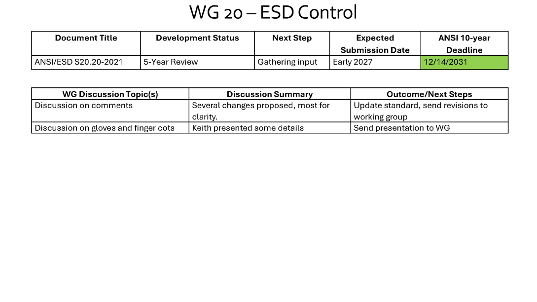 The WG discussed the revisions needed for TR20.20 “Handbook for the Development of an Electrostatic Discharge Control Program for the Protection of Electronic Parts, Assemblies and Equipment”