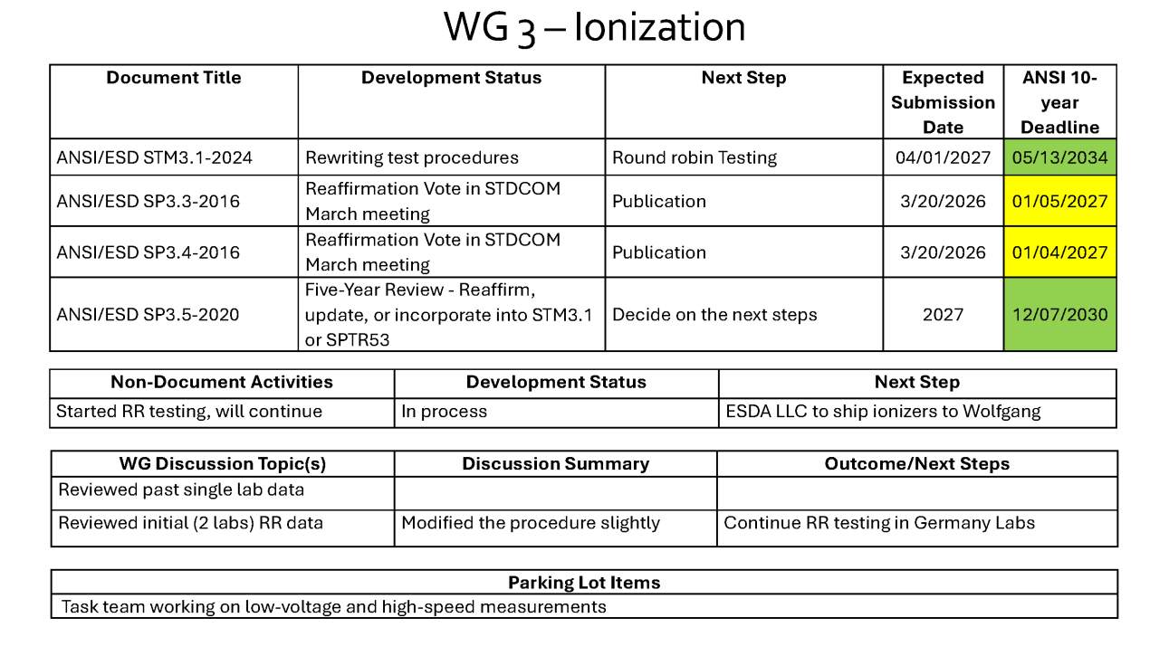 WG focused on the review of STDCOM comments on ANSI/ESD SP3.4 “Periodic Verification of Air Ionizer Performance Using a Small Test Fixture” and made any necessary changes. ANSI/ESD STM 3.1, “Ionization”, is also going through an update process, with initial STDCOMV VBM comments being reviewed and changes being made.