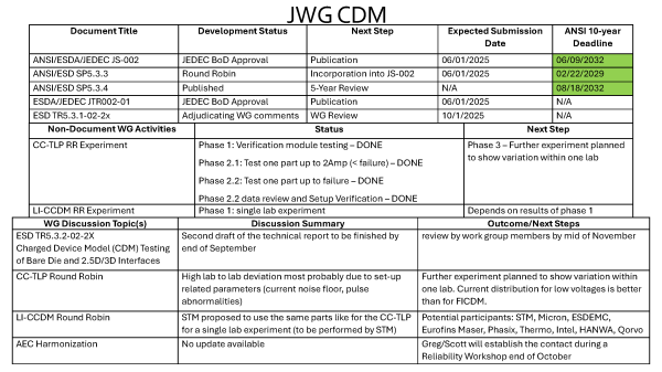 The joint working group adjudicated industry review comments on the five year review revisions of ANSI/ESDA/JEDEC JS-002. The joint working group also adjudicated TAS comments on the new user guide technical report – ESD JTR002-01. A data update on the LICCDM round robin was given and methods for improving current measurement were discussed. STDCOM VBM comments for a new standard practice on CC-TLP (ESD WIP5.3.4) were adjudicated.