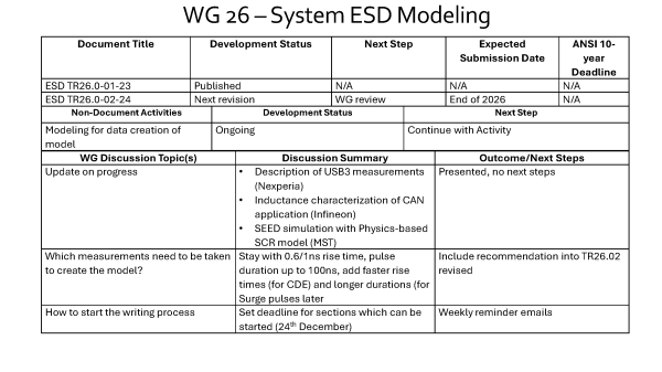 A presentation was given on a quasi-static model to evaluate if the exchange format works. An update was given on a modular PCB approach for validation. The status of ESD TR26.0-01 and ESD TR26.0-02 was also reviewed.